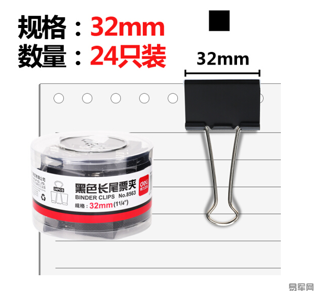 - 商品名稱:得力(deli)24只32mm黑色長尾票夾 金屬票據夾燕尾夾鐵夾子 中號8563